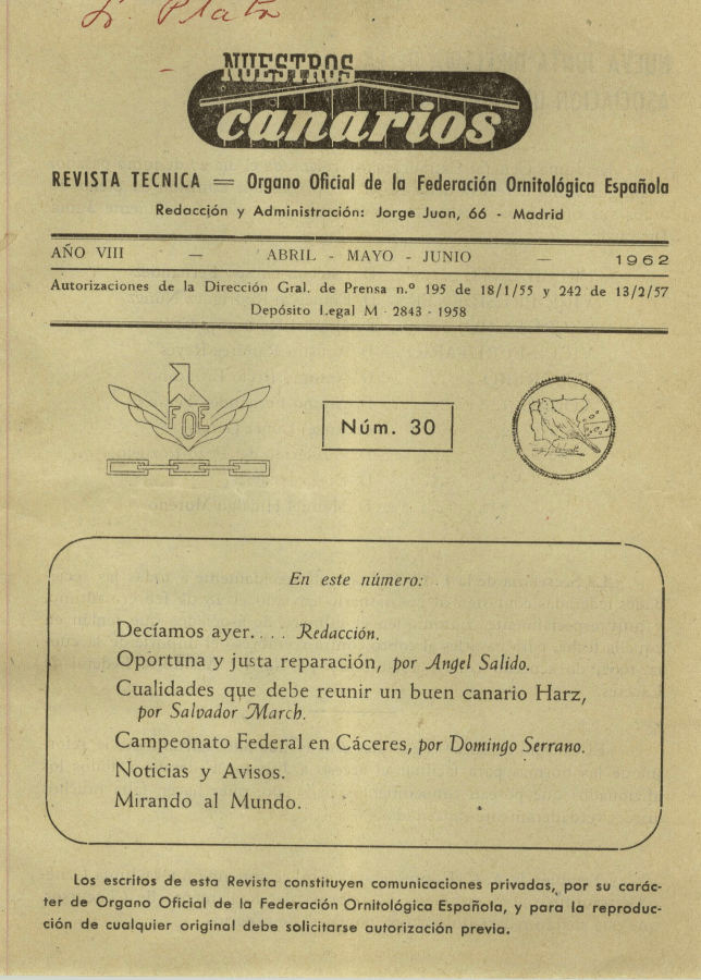 BIBLIOTECA: Nuestros Canarios, 2º Trimestre de 1962