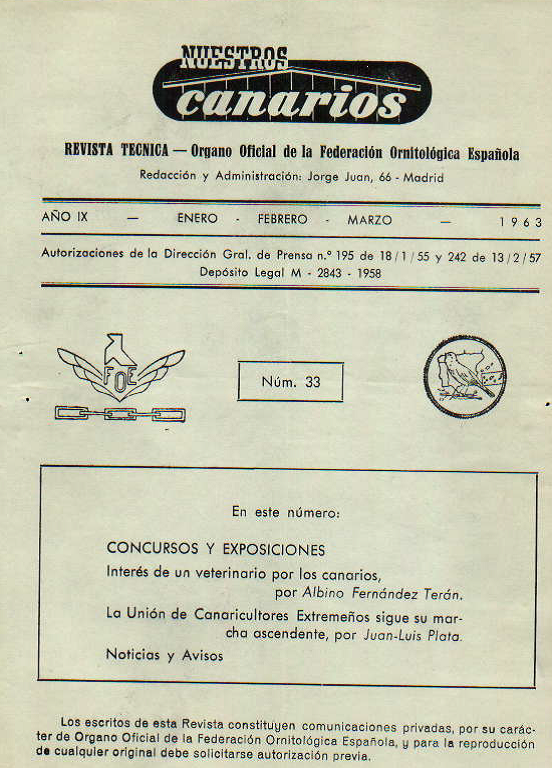 Subimos hoy a la Biblioteca, el fascículo correspondiente al primer trimestre de 1963 de «Nuestros Canarios»