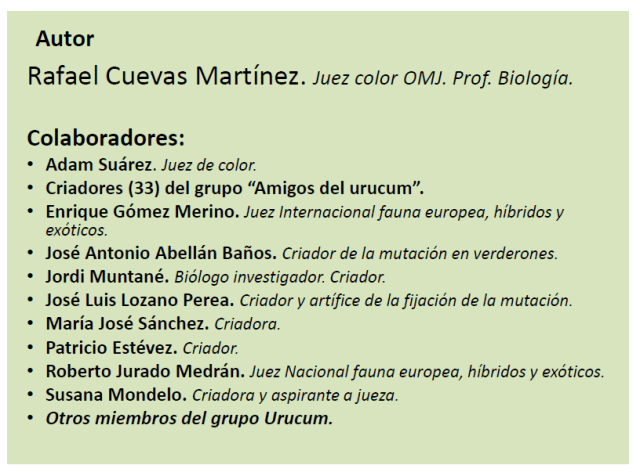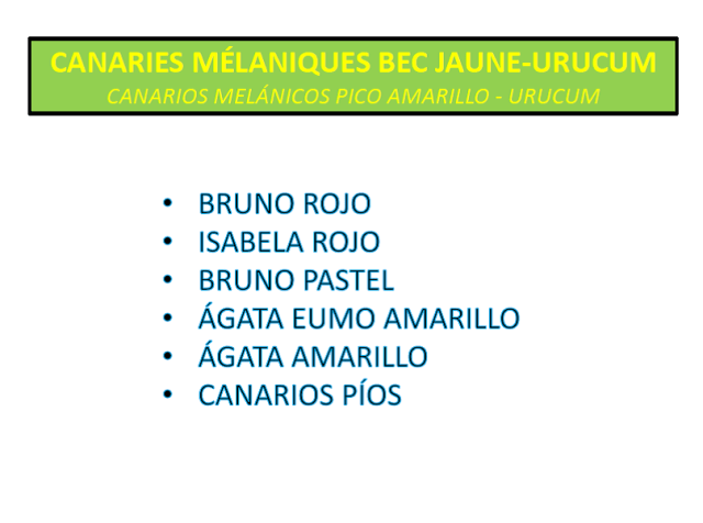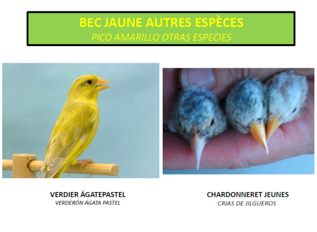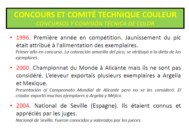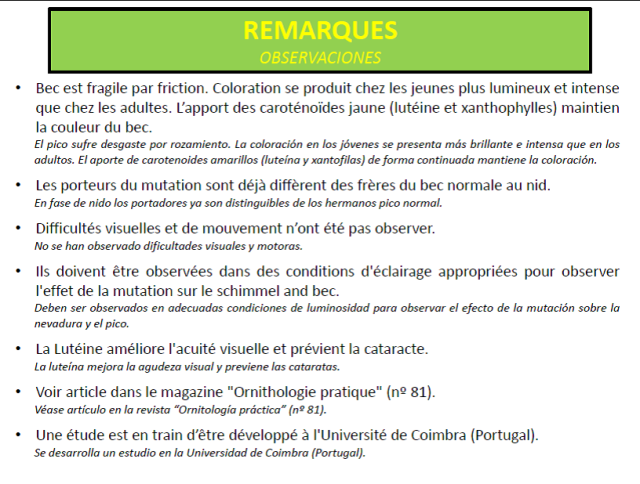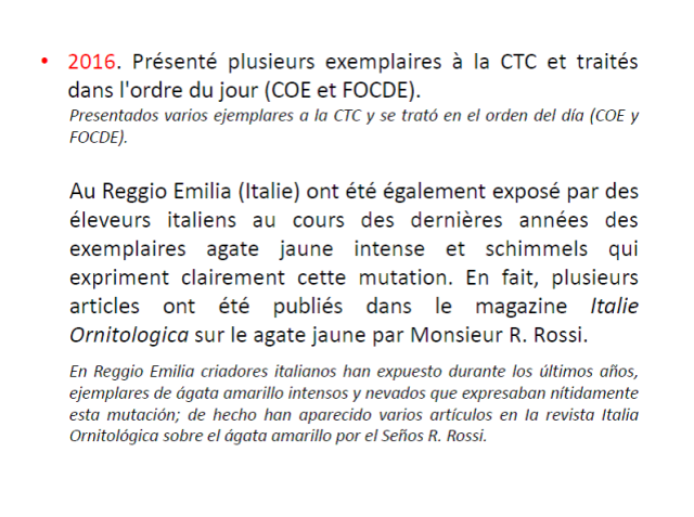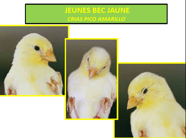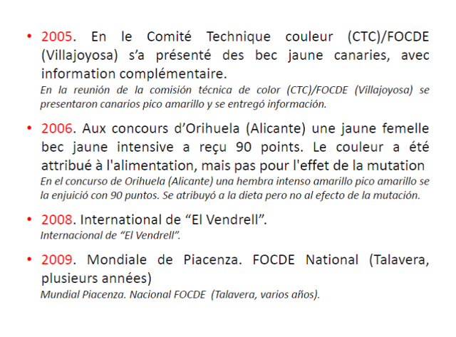 «Estimados criadores, os envío este documento (pdf) -del que soy autor y en el que han colaborado varios jueces y criadores de la mutación-, sobre el canario amarillo de pico amarillo y que, con motivo de su posible reconocimiento en el pasado Cpto Mundial de Almería, elaboramos durante varios meses. El documento como observaréis, está en francés y español y traducido además a cuatro idiomas.