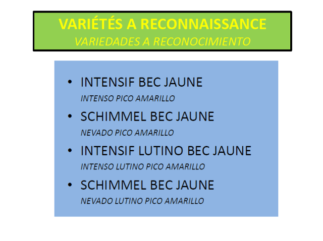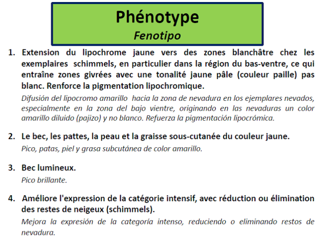 En este documento se analiza el origen, fenotipo, concursos donde han sido presentados, estándar provisional, canarios de color y ejemplares fauna europea y exóticos, donde está incorporada la mutación pico amarillo, observaciones…