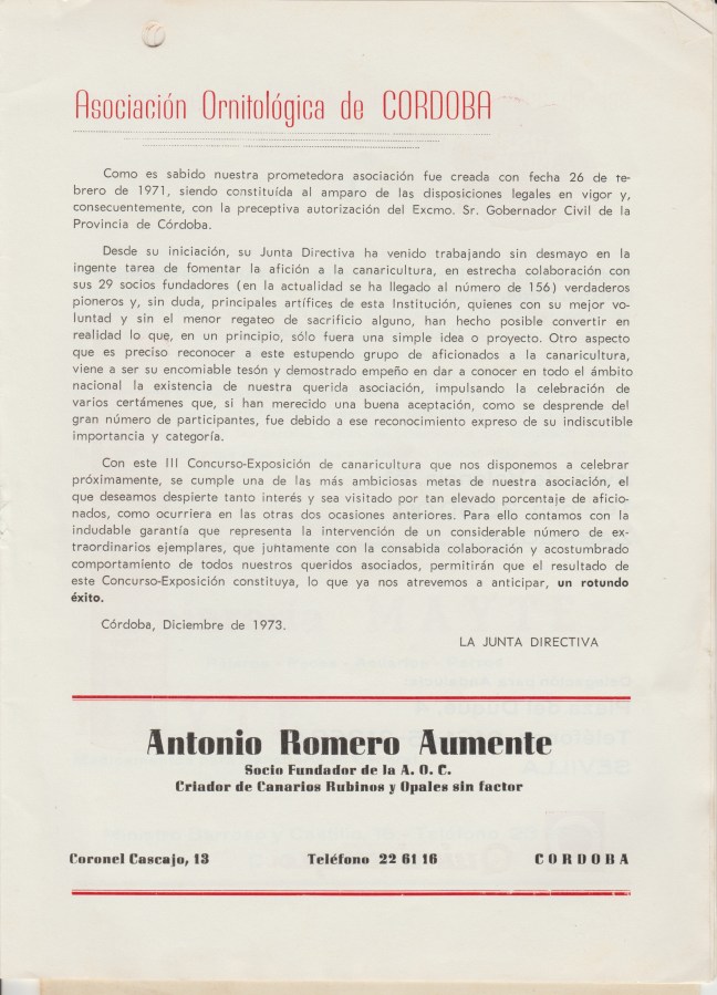 MEMORIA DE UNA AFICIÓN (Concursos): Asociación Ornitológica de Córdoba, 1974